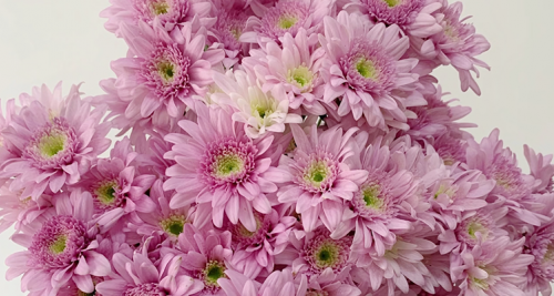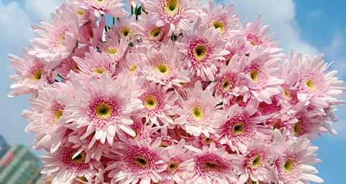 外观特征:花朵颜色粉嫩,花头中等大小。它是双花型小菊,外层为长花瓣,内部是羽毛状花瓣,随着花朵开放,内层羽毛状花瓣会逐渐显现,花心呈绒绒的状态。花量极大,一根花茎上通常有十几二十个花头,开花时只见花不见叶。