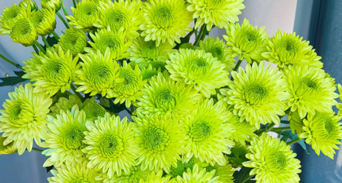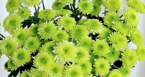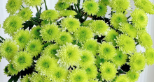 花色花型:花瓣为黄绿色,初期颜色较深,随着开放会慢慢变浅。花型为绒球型,盛开时花头饱满圆润,花瓣层次多,属于中型花多头菊。