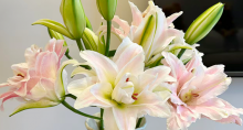 花色花型:花瓣颜色为粉嫩的粉色,中间有粉色喷点,色彩清新淡雅。花瓣比较宽,呈层层叠叠的重瓣状,花型饱满,花朵直径较大。通常一支花茎上有 2 个花苞,花朵绽放时显得十分华丽。